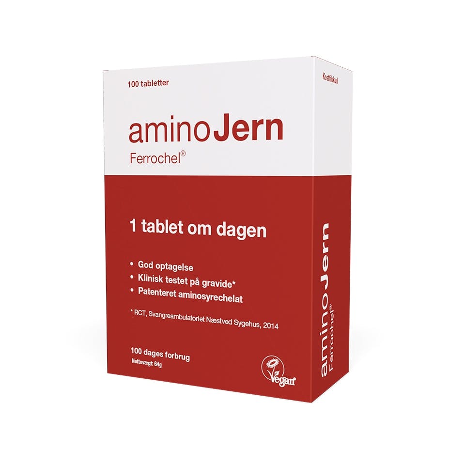 Jerntilskuddet aminoJern består af aminosyrecheleret jern, og forskning viser, at den jerntype sikrer en god optagelse i kroppen. Aminosyrechelatet 'smugler' jernet gennem mavesækken som en blind passager. Dermed optages jernet gennem aminosyrernes særlige optagekanal, så man får en skånsom optagelse.