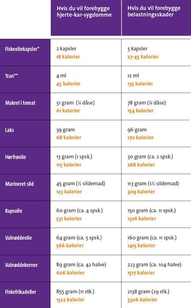 Skemaet her er vigtigt af to grunde. For det første kan du se, hvor meget du skal spise af forskellige råvarer for at få nok omega-3