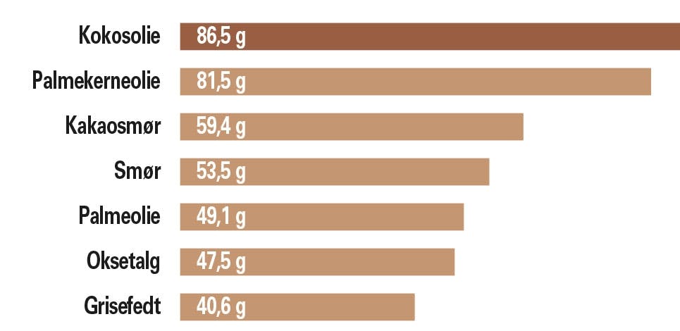 Bruger du kokosolie til stegning eller i bagværk, og spiser du samtidig kød og mejeriprodukter, kommer du derfor hurtigt til at overskride sundhedsmyndighedernes anbefalinger, da knap 90 pct. af kokosolien består af mættet fedt.