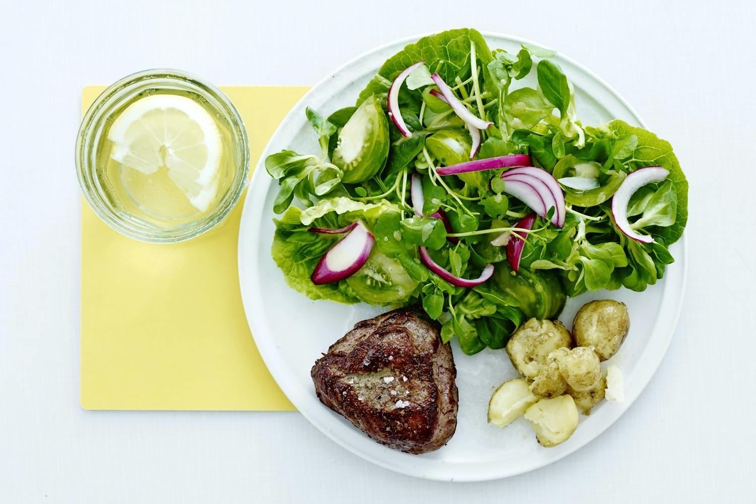 Anret steaks med knuste kartofler (giv dem et let tryk med en stor ske), salat og brøndkarse.