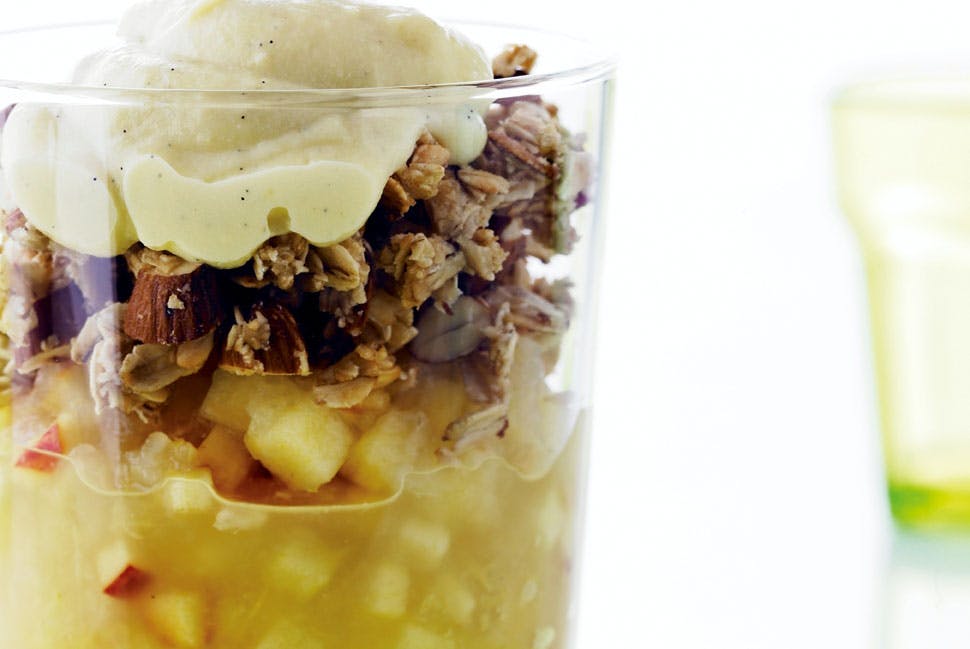 Traditionelt spiser man flødeskum, creme fraiche eller vaniljeis til en æblecrumble.