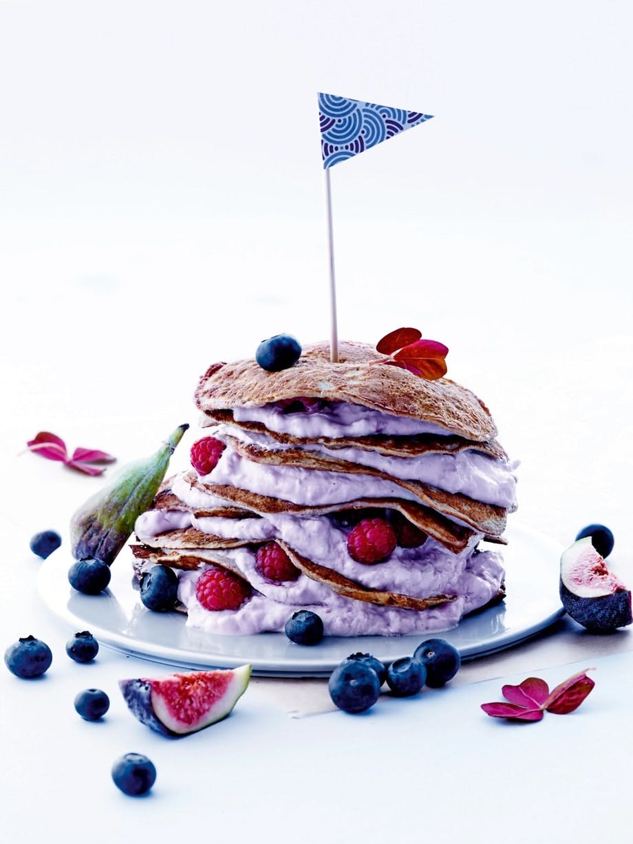 Sunde opskrifter Pandekager Pandekaget... Pandekagetårn med hindbærcreme 30 minutter 231 kcal Var det noget med et cremet pandekage-tårn med hindbærcreme og frisk frugt, så prøv opskriften uden mel og sukker. Af Michelle Kristensen 27. august 2016 HINDBÆR PANDEKAGETÅRN - helt uden mel og sukker Pandekagetårn med hindbærcreme Ingredienser Sådan gør du Fakta Føj til favoritter Fjern fra favoritter Undgå at skærmen slukker Ingredienser 2 personer (der skulle gerne blive 8-9 pandekager.) ¼ moden banan ¼ tsk. vaniljepulver ¾ æg ¾ æggehvider ¼ dl knust hørfrø Kokosolie til stegning Hindbærcreme 62 g mascarpone 50 g skyr ¼ tsk. stevia ¼ tsk. vaniljepulver 31 g hindbær Topping 31 g bær og evt. andet frugt Sådan gør du Bland alle ingredienserne til dejen sammen, og steg pandekagerne i lidt kokosolie på en pande. Mens pandekagerne køler af, rører du cremen sammen. Fordel cremen mellem pandekagerne, og pynt med bær og frugt. Skær kagen ud i 8 stykker med en skarp kniv. Se alle vores opskrifter på lækre sunde pandekager her SteviaBrunch