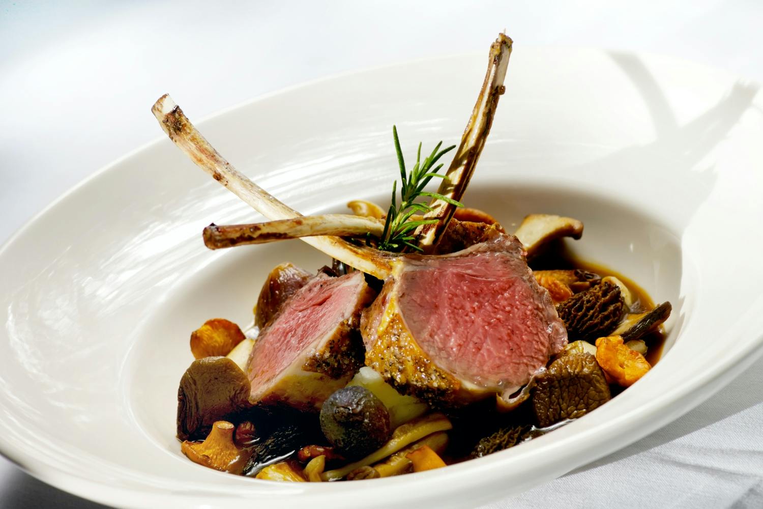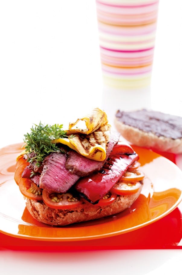 Græsk burger med lammefilet, grillet grønt og oliventapenade