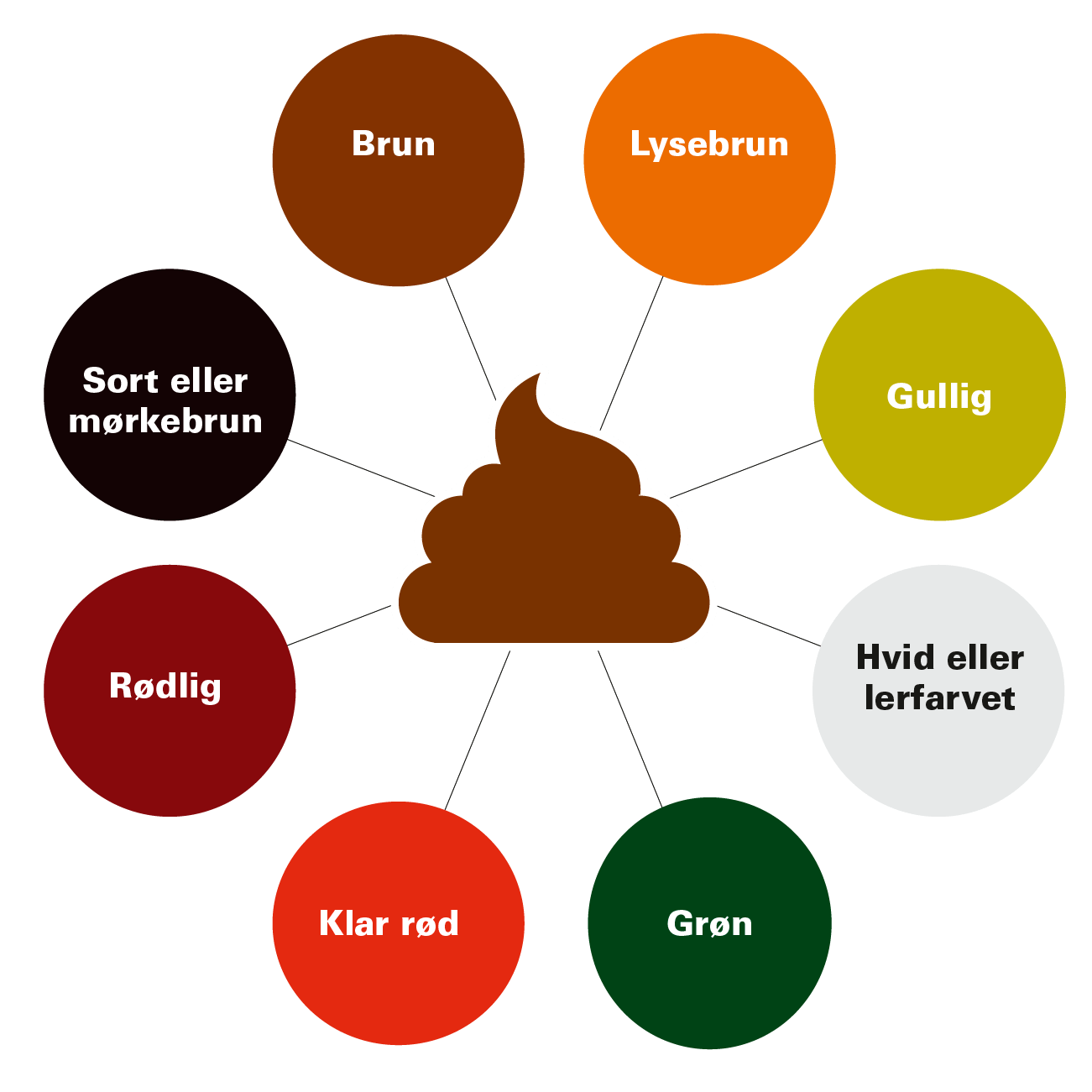 Afføring kan farves fx efter den mad, du har spist. Her kan du se, hvilke nuancer den kan have.