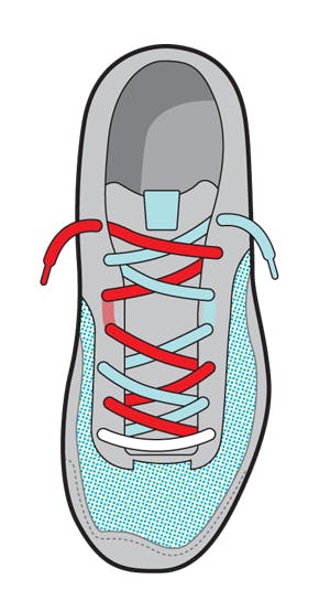 Den, der snør’ godt ...Snøringen her er velegnet til løbere med høj vrist. Snør skoene på almindelig vis, indtil du når det punkt, hvor skoen trykker. Undlad nu at trække snørerne på tværs af skoen, og træk dem i stedet indvendigt op langs skoen. På den måde dannes et område, hvor snørebåndene ikke går på tværs.