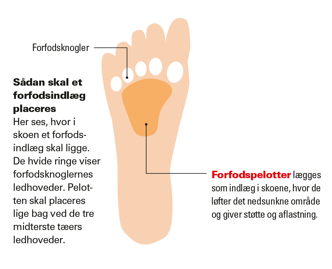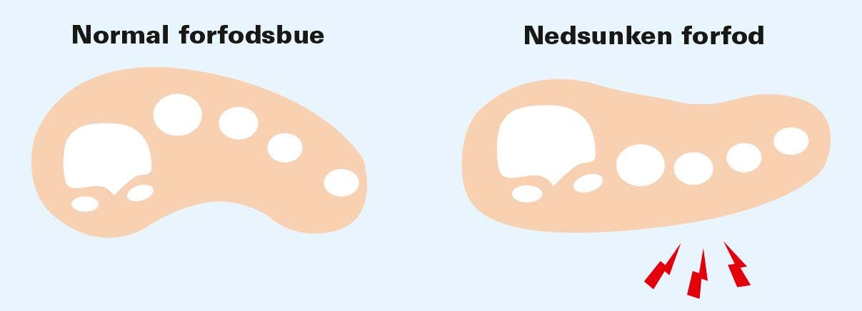 Men i en nedsunken forfod er bindevæv og ledbånd mellem led og knogler faldet sammen, og fodbuen er forsvundet. Det betyder, at presset fordeles fra store- og lilletå og ud på de tre tæer i midten. Det er deres led og knogler slet ikke bygget til, så de svarer igen med ømhed og smerter. Det er også almindeligt, at hård hud og ligtorne følger med som “bonusgevinst”.