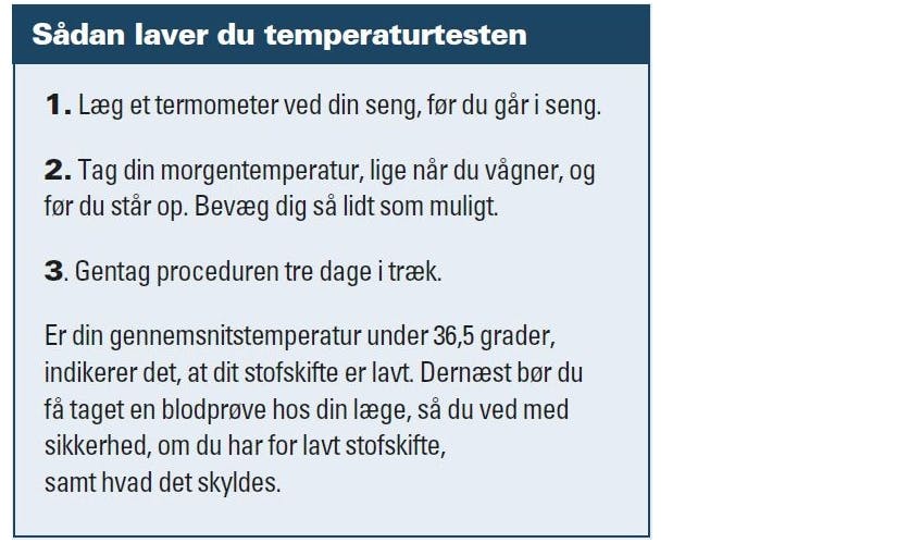 Hvis du er meget kuldskær og har svært ved at få varme ud i hænder og fødder, kan det være tegn på, at dit stofskifte kører på nedsat kraft. Når kroppen bliver langsommere til at omdanne næringsstoffer som proteiner, kulhydrater, fedt og vitaminer til energi, bliver blodomløbet nemlig også forringet betragteligt - og dårligt blodomløb giver en lavere kropstemperatur. Ved at måle din temperatur over flere omgange - også kendt som The Basal Temperature Test - kan du få en indikation af, om dit stofskifte er for lavt gearet.