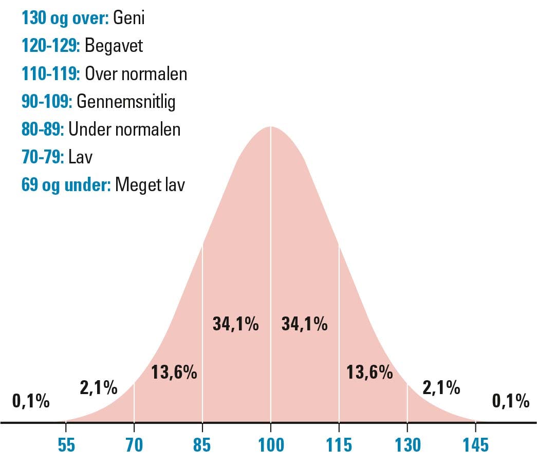 IQ-tests er bygget sådan op, at den gennemsnitlige IQ i en befolkning er sat til 100 point. Det betyder, at man først beslutter sig for, at den gennemsnitlige IQ er 100 point, og så ser man på, hvordan alle andre fordeler sig efter den midte. Der viser det sig, at 70 pct. af befolkningen har en IQ på mellem 85 og 115 point. Nogle IQ-tests inddeler desuden folk i flere grupper, som er:
