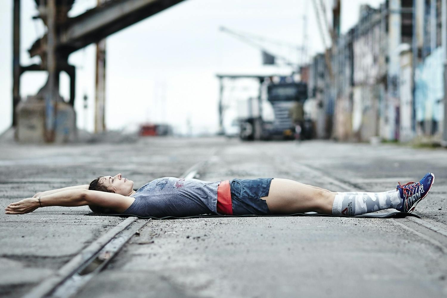 - Lig på ryggen med strakte ben og armene strakt over hovedet. Dette er det eneste tidspunkt i øvelsen, hvor arme og ben kommer til at røre jorden!
