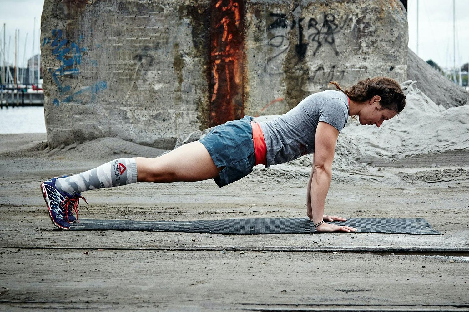Herefter sænker du kroppen langsomt ned mod måtten igen – forsøg at lade brystet være det første, der rører måtten. Gentag øvelsen forfra, blot med modsatte knæ til albue. - Dét er i alt 1 gentagelse!