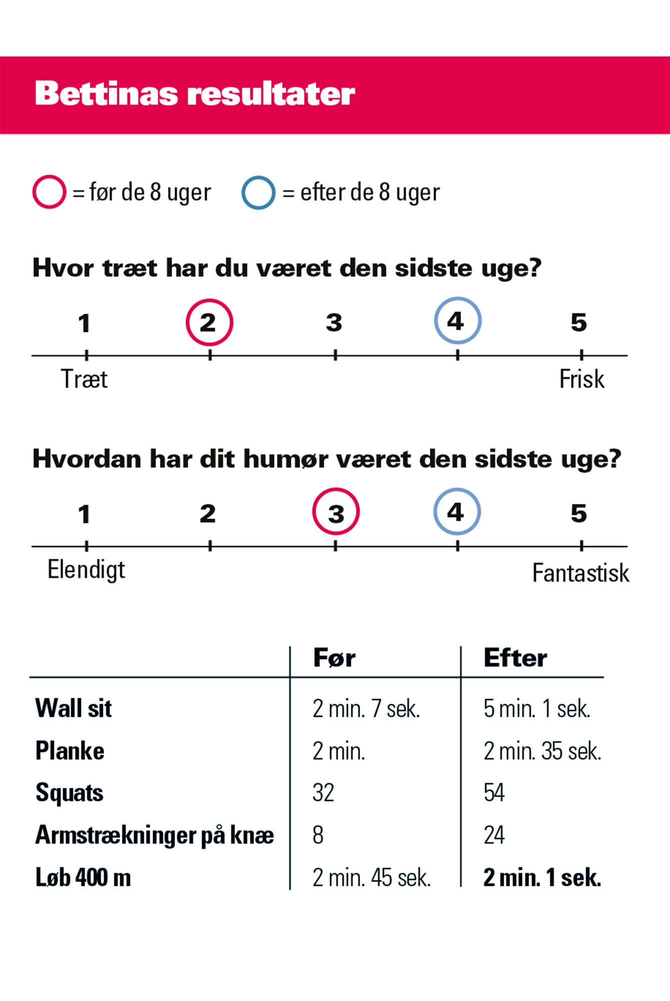 Både før og efter de 8 uger besvarede Bettina et kort spørgeskema, og personlig træner Christina Heick testede hendes styrke og kondition. Se her, hvordan det gik.