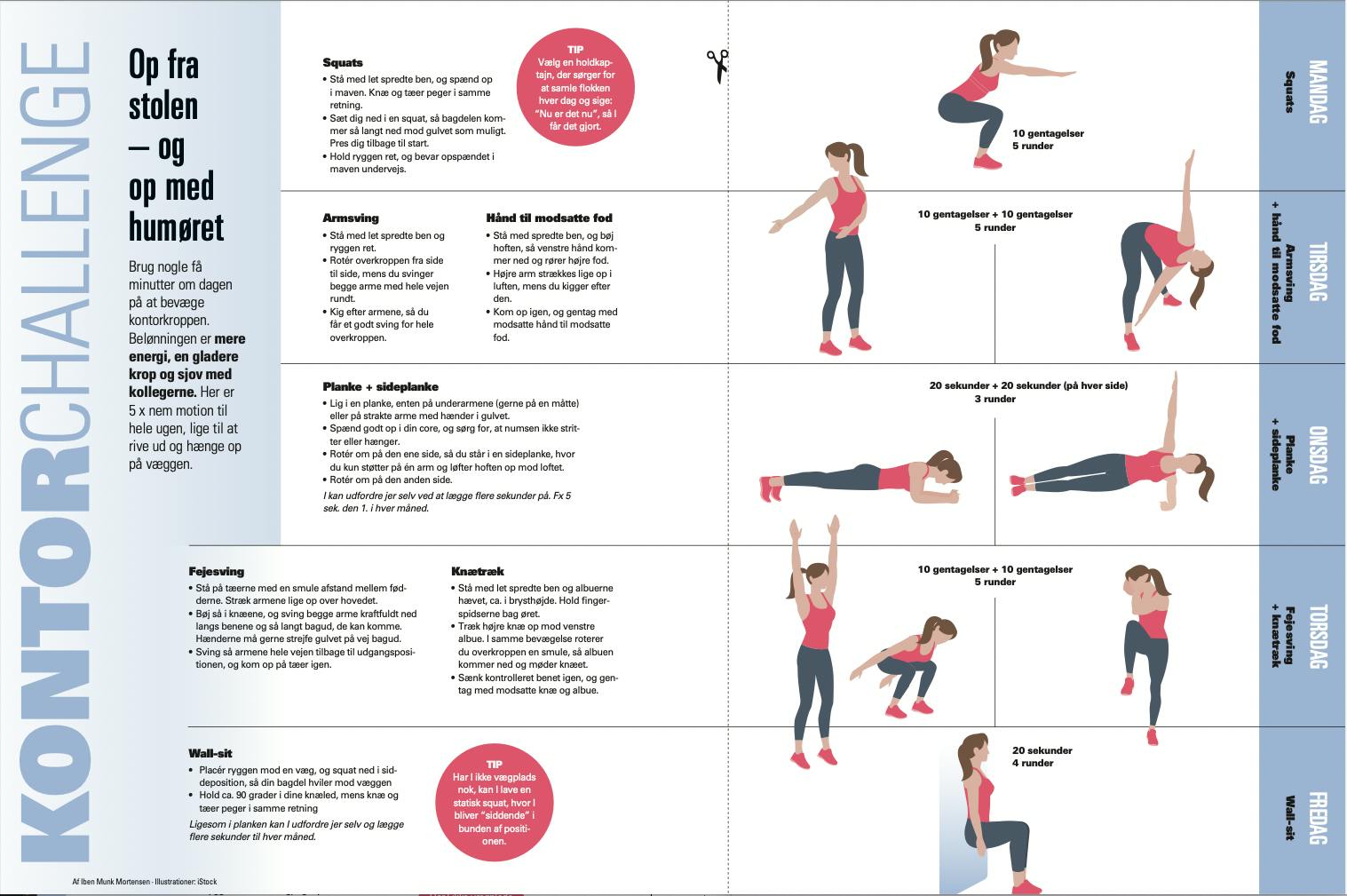 2-3 minutter. Mere kræver det ikke at få gang i kroppen og smil på læben. Her giver vi dig og dine kolleger en minitræning til hver dag i ugen. Lige til at hænge op på kontoret.
