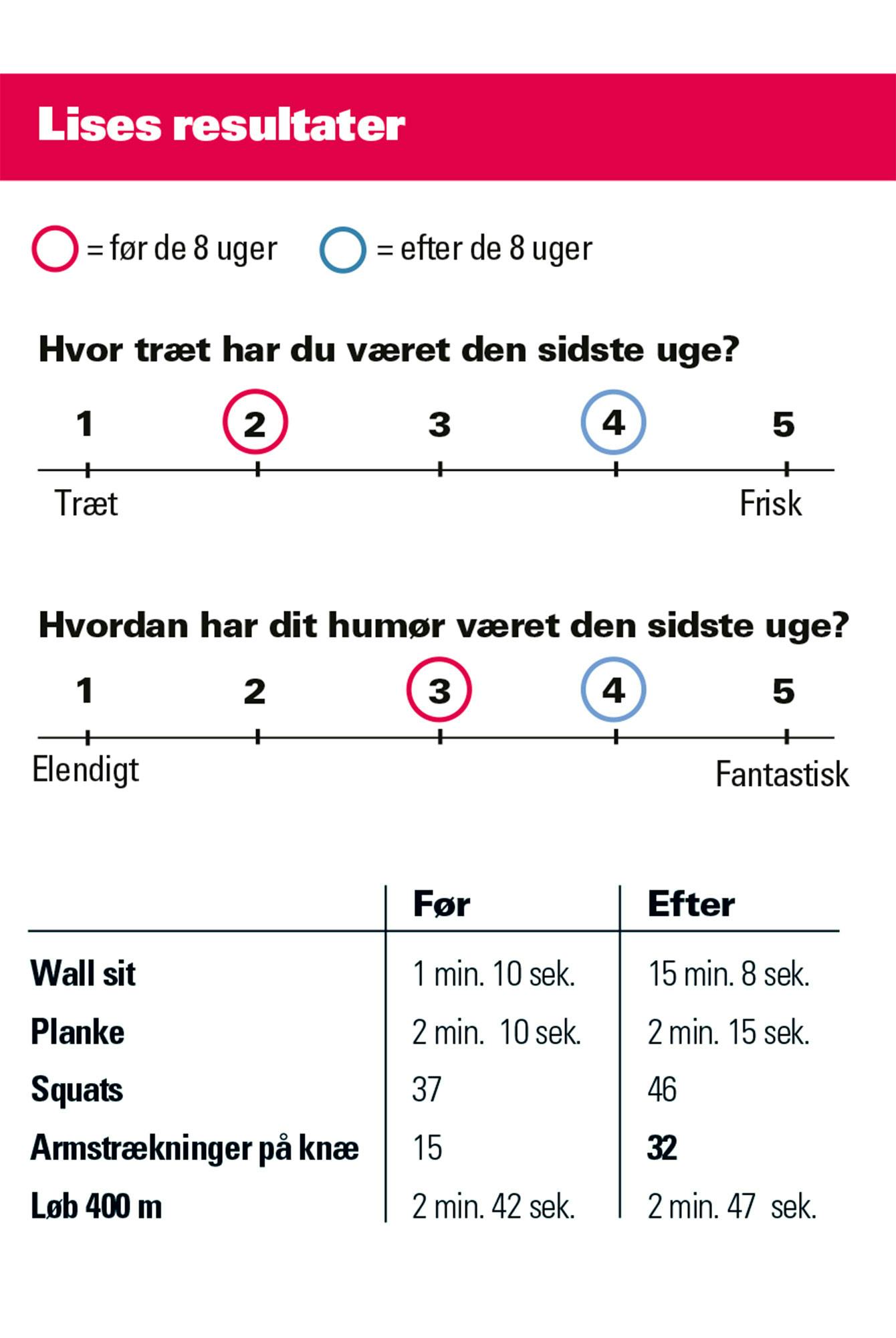 Både før og efter de 8 uger besvarede Lise et kort spørgeskema, og personlig træner Christina Heick testede hendes styrke og kondition. Se her, hvordan det gik.