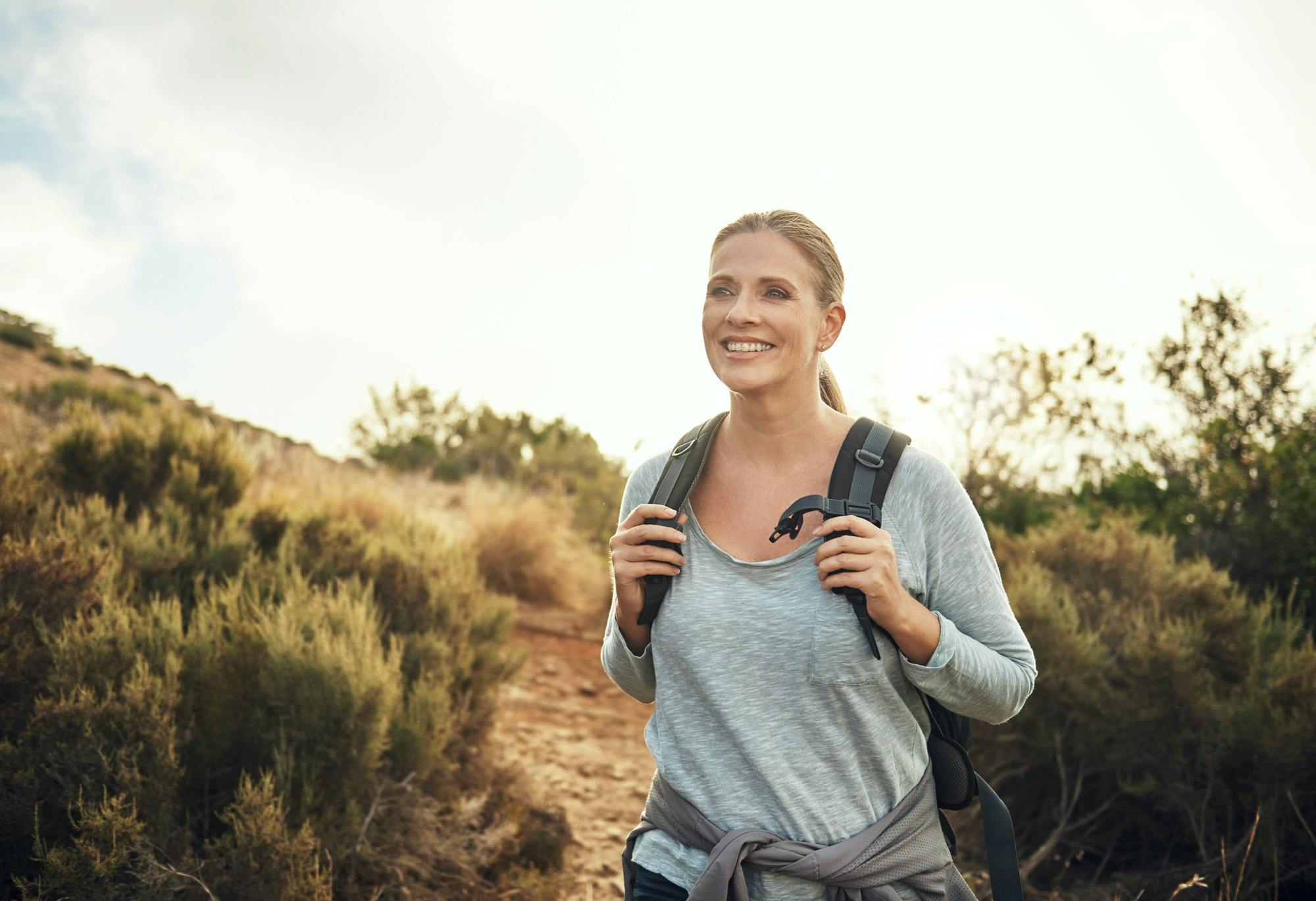 Kvinde i rask gang - gåtur med hund - forbrænder kalorier