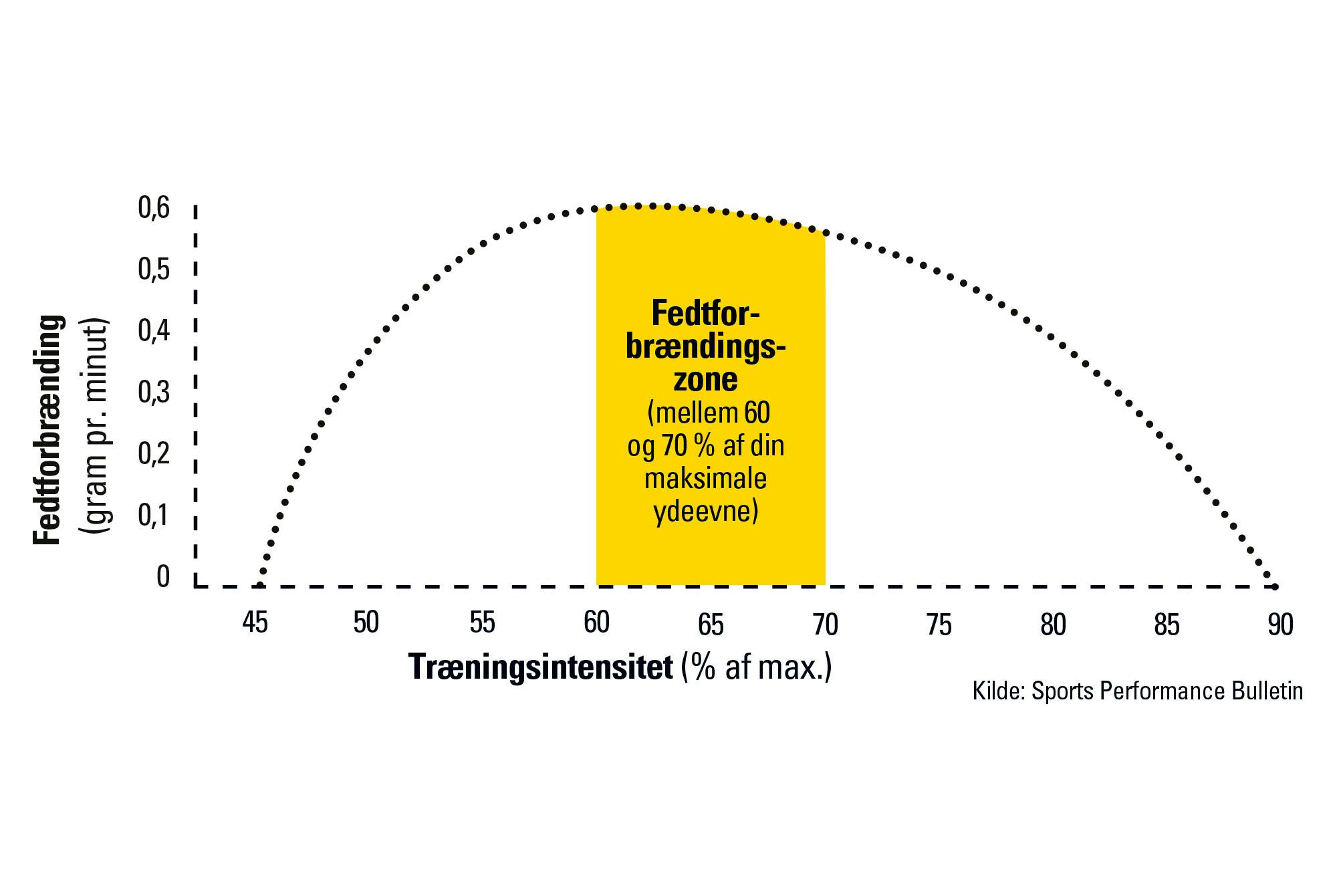 Når du træner, kommer energien fra en kombination af fedt og kulhydratet glykogen. Jo lavere intensitet du træner med, jo større andel af energien kommer fra fedt. Men jo højere intensitet du træner med, jo mere energi bruger du i alt. Tilsammen betyder det, at du forbrænder allermest fedt i zonen, hvor du ligger mellem 60 og 70 % af din maksimale ydeevne. Alligevel får du ofte – på sigt – et større vægttab ud af at motionere med højere intensitet. Det skyldes bl.a., at det giver en større efterforbrænding, hvor din krop fortsat forbrænder fedt i timerne efter din træning. Højere intensitet giver dig også hurtigere en bedre kondi og en større muskel- masse, som øger din samlede evne til at forbrænde fedt både under træning og i hvile.