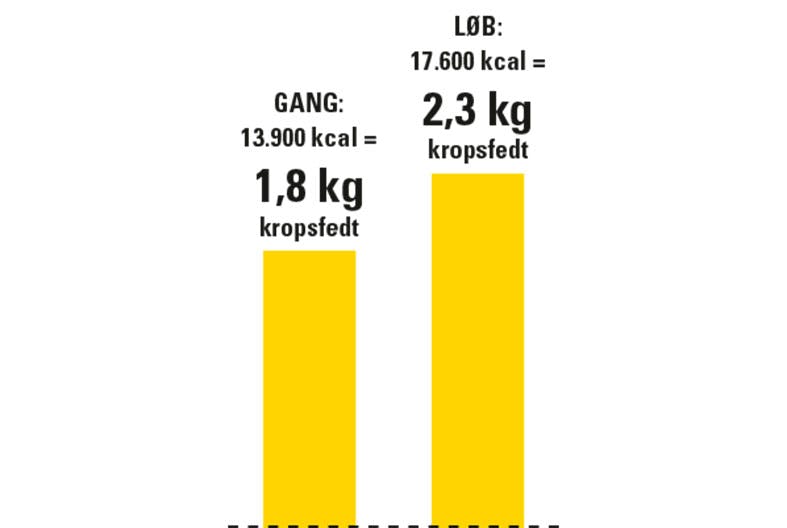 Går eller løber du 5 km tre gange om ugen, men fastholder dit kalorieindtag, kan du på et år forbrænde: