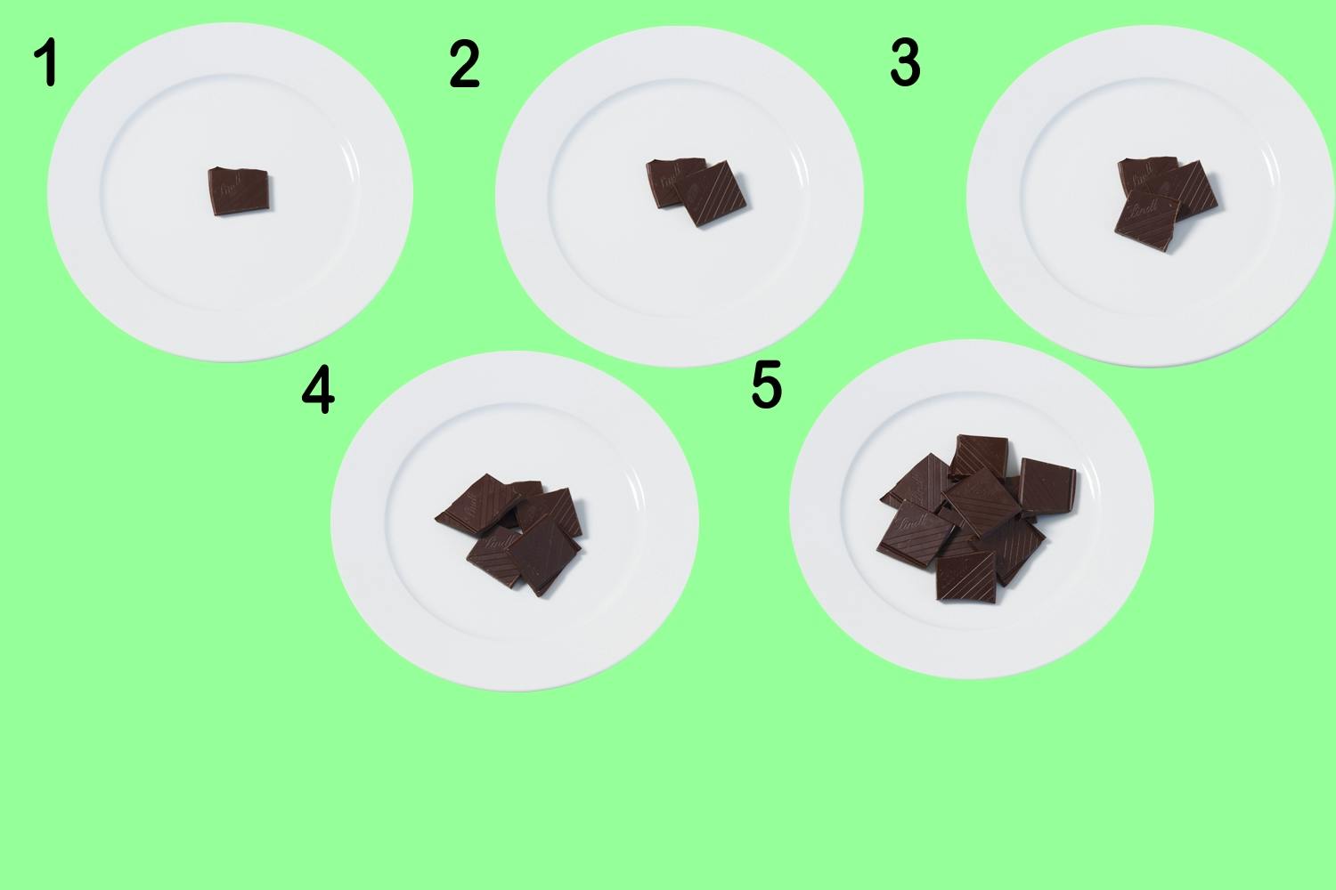 Mørk chokolade: 1. 50 kalorier = 9 gram 2. 100 kalorier = 19 gram 3. 150 kalorier = 28 gram 4. 250 kalorier = 47 gram 5. 500 kalorier = 93 gram