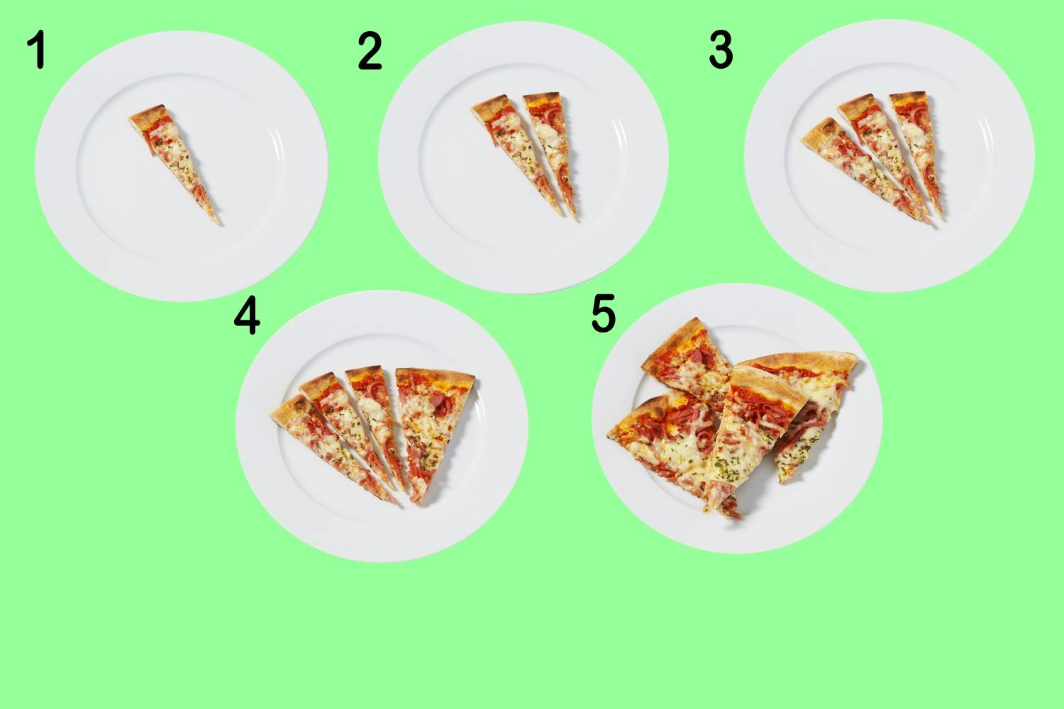 Pizza med skinke og ost (250 kcal/100 gram): 50 kalorier = 20 gram 100 kalorier = 40 gram 150 kalorier = 60 gram 250 kalorier = 100 gram 500 kalorier = 200 gram
