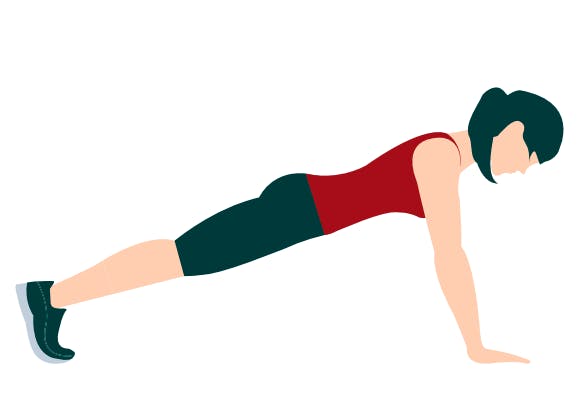 | 8 x armbøjninger Stil dig i en planke på tæerne med hænderne i skulderbreddes afstand. Sug navlen godt ind, og sænk så langsomt brystet, indtil det rører jorden uden at komme helt ned og hvile. Skub dig op igen ved armenes kraft. Kan evt. laves på knæene |