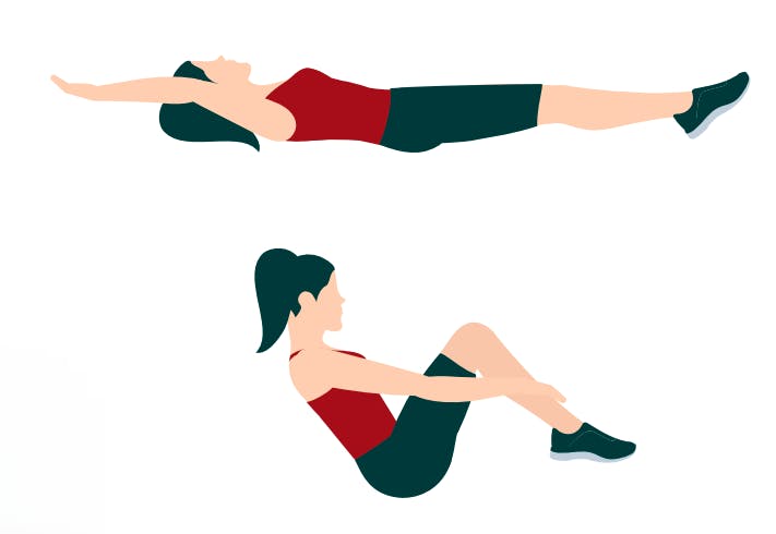 | 16 x atomic sit-ups Læg dig udstrakt på ryggen med arme og ben let hævet over jorden. Spænd op i maven, og hold lænden i gulvet. Sæt dig så op i en mavebøjning, og træk benene med op i samme bevægelse, så du rører dine ankler med hænderne. Stræk dig ud igen til startpositionen, uden at ben og arme rører jorden |