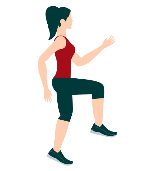 | 32 x løb med knæløft Løb på stedet, mens du løfter knæene. Sving samtidig dine arme kraftfuldt op og ned i takt med benenes bevægelse. Prøv, om du kan få knæene helt op i hoftehøjde. |