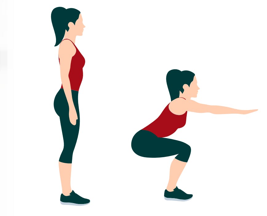 | 16 x squats Stå med ret ryg og skulderbreddes afstand mellem fødderne. Sænk numsen mod gulvet, som om du sætter dig på en skammel. Pres dig op igen med vægten i begge hæle. Bær evt. to håndvægte i hver hånd for større belastning |