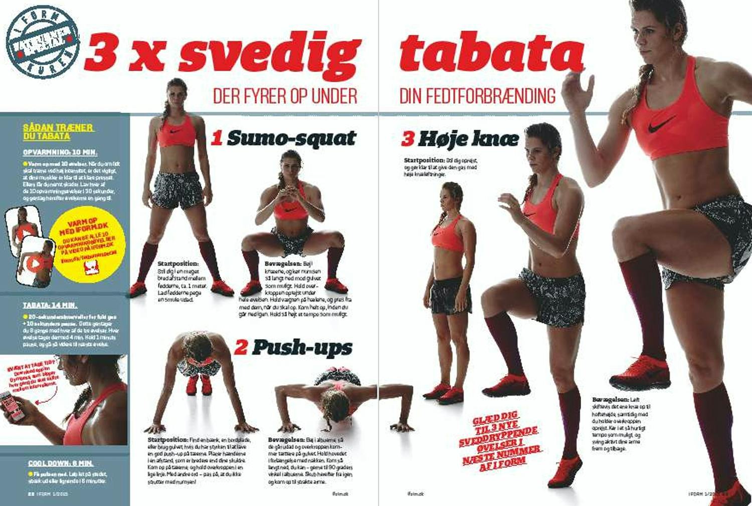 Træningen består af et 14 minutter kort men supereffektivt program med tabata-øvelser, som du kan udføre derhjemme.